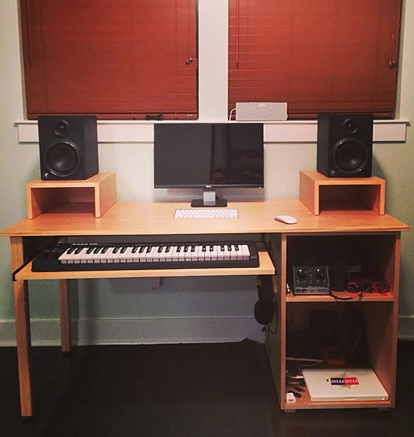 The keyboard sits on a roll out shelf. the cabinet on the side was specifically designed to hold all his hardware and equipment as well as laptop. Under the keyboard tray you can see a pair of headphones hanging on a little hook I made from a few pieces of scrap maple.