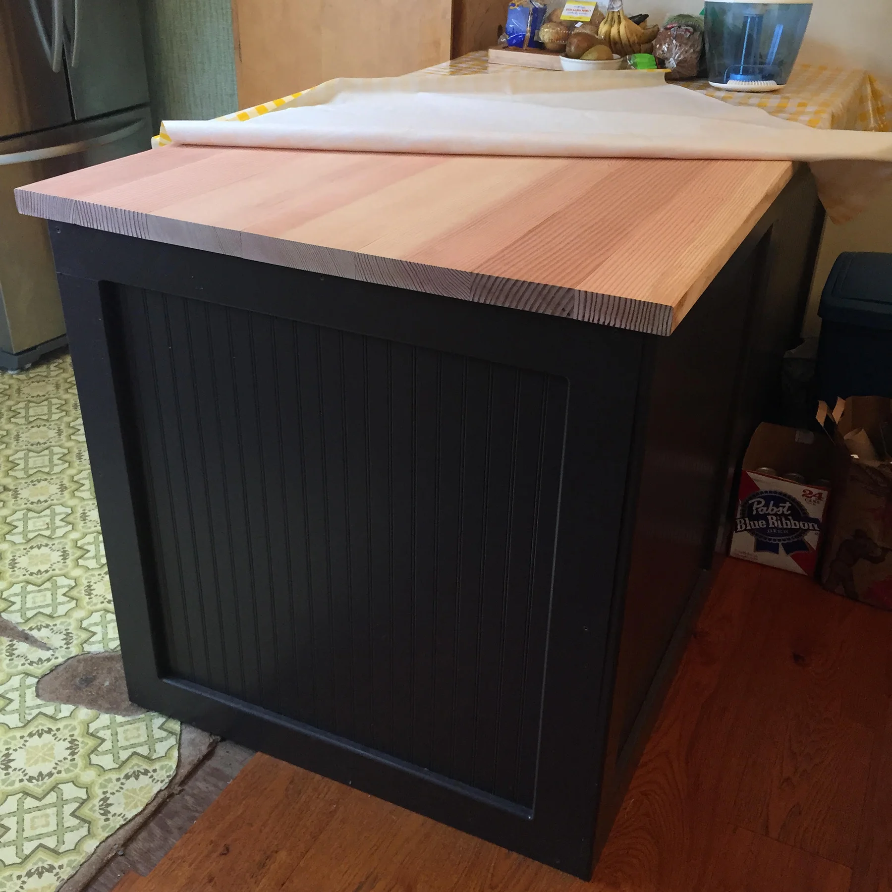 The new island is a simple 2x4 frame with panels made from waistcott and 1x4's. The top is douglas fir 2x planks that we planed down and joined together. The base is painted a dark brown to match the general color palate of the house (my Dad takes tonality to a whole new level) and the top we kept natural with a clear wood sealer.
